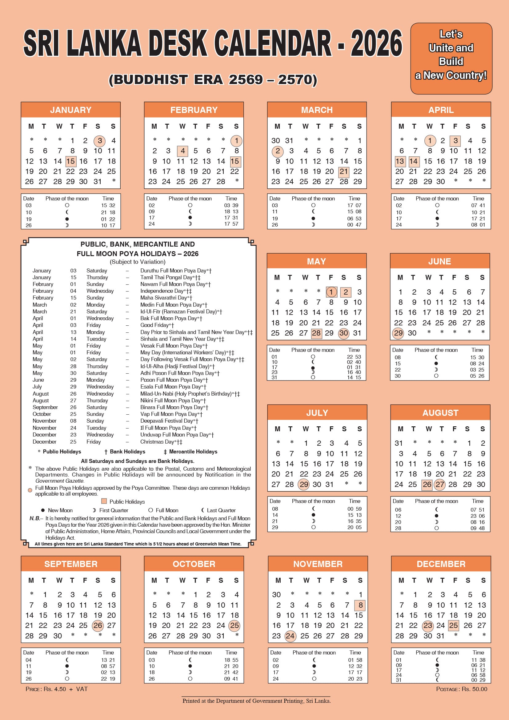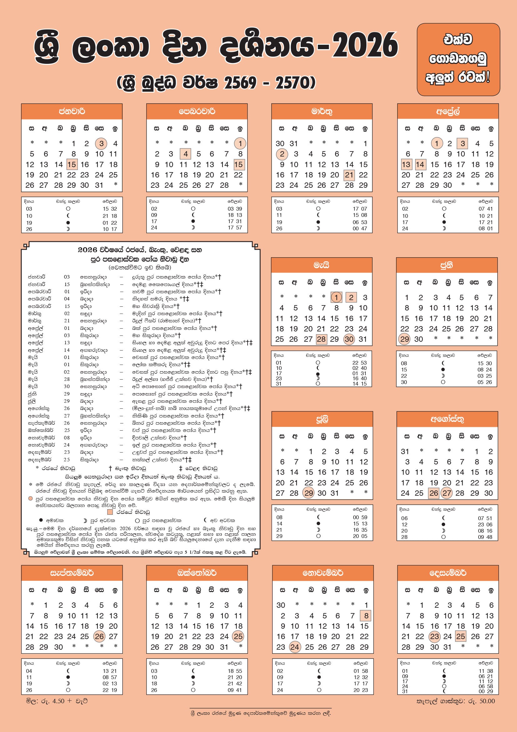 それとは別に、スリランカで祝われる他の重要な祝日には、建国記念日、労働者の日、元旦、シンハラ語とタミル語の新年、預言者ムハンマドの誕生日(ミラド・ウン・ナビ)、タイのポンガルの日、マハシヴァラートリ、イードなどがあります。 -アル・フィトル、イード・アル・アドハー、クリスマスの日。これらの中には、祝日、銀行休業日、商業休業日も含まれますが、企業セクターが引き続き営業する祝日や銀行休業日のみとなる日もあります。休暇は通常、雇用主の裁量により、宗教的および国家的な祭りの行事のために与えられます。