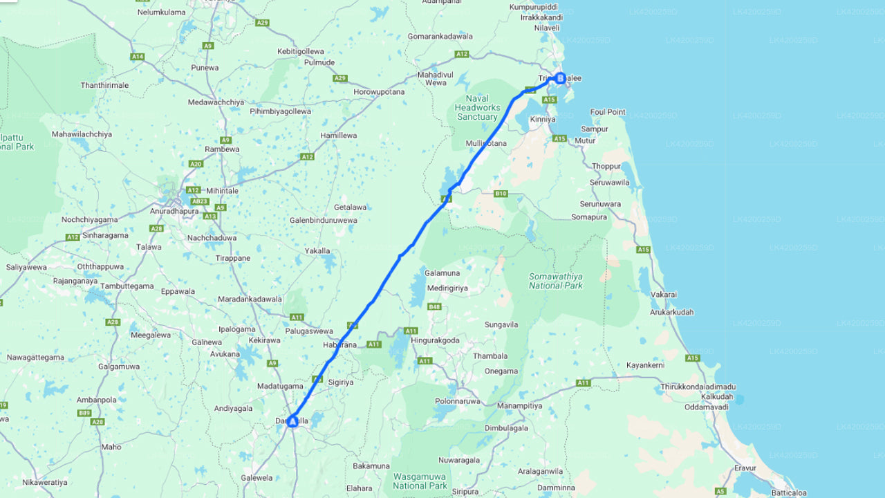 - Pick-up within the city limits of Dambulla and drop-off within the city limits of Trincomalee.