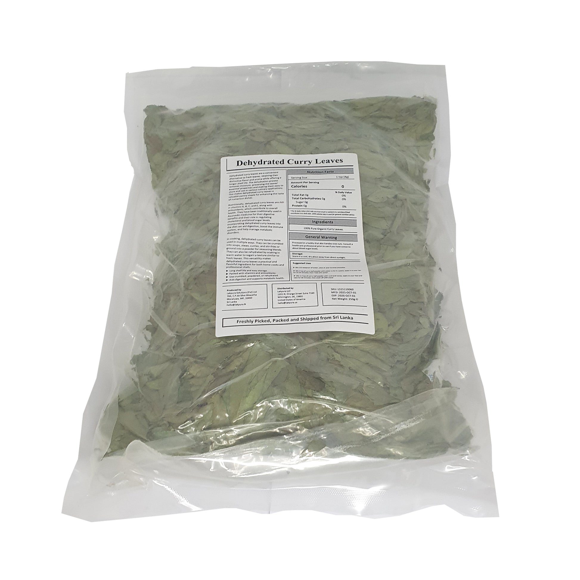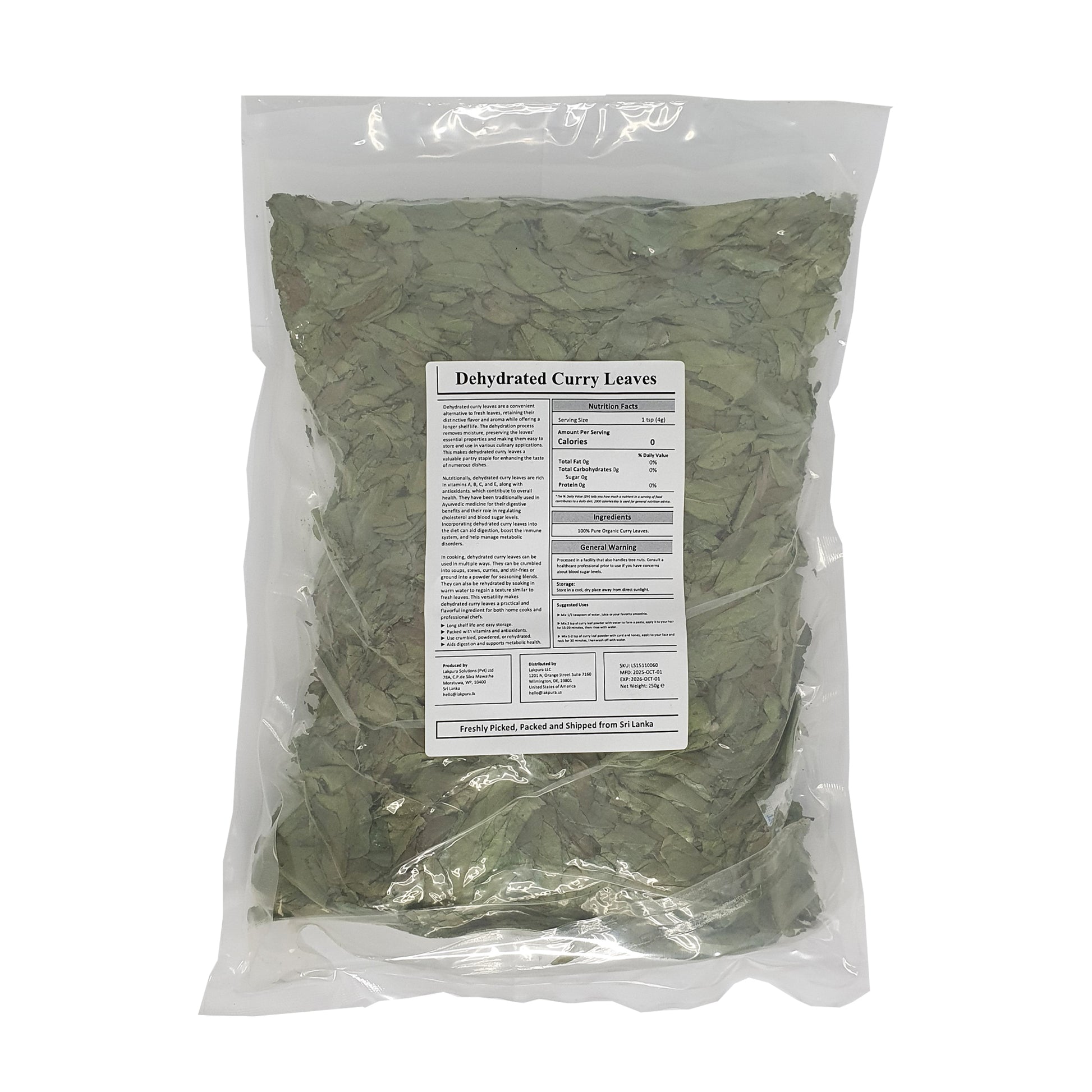 Lakpura® Curry Leaves は主に家庭菜園や小規模な農地から収穫され、厳格な衛生状態で選別および乾燥されます。これにより、葉の栄養素と香りが失われることはありません。カリーリーフは、栄養価を損なうことなく長い保存期間を提供するために乾燥されます。これらの葉は、カレー、チャツネ、炒め物、さらにはスープに使うと、非常にユニークな土のようなシトラスの香りを発します。