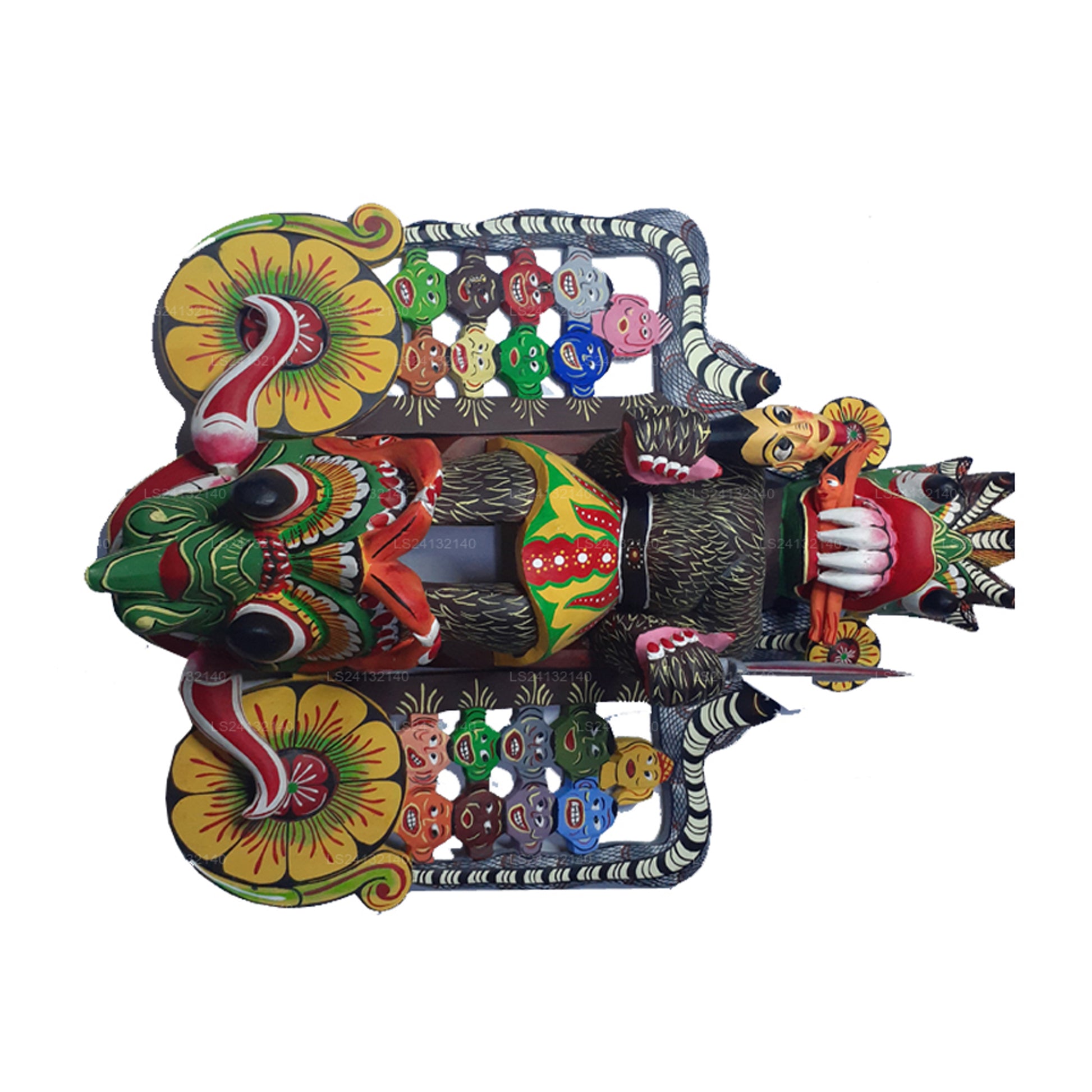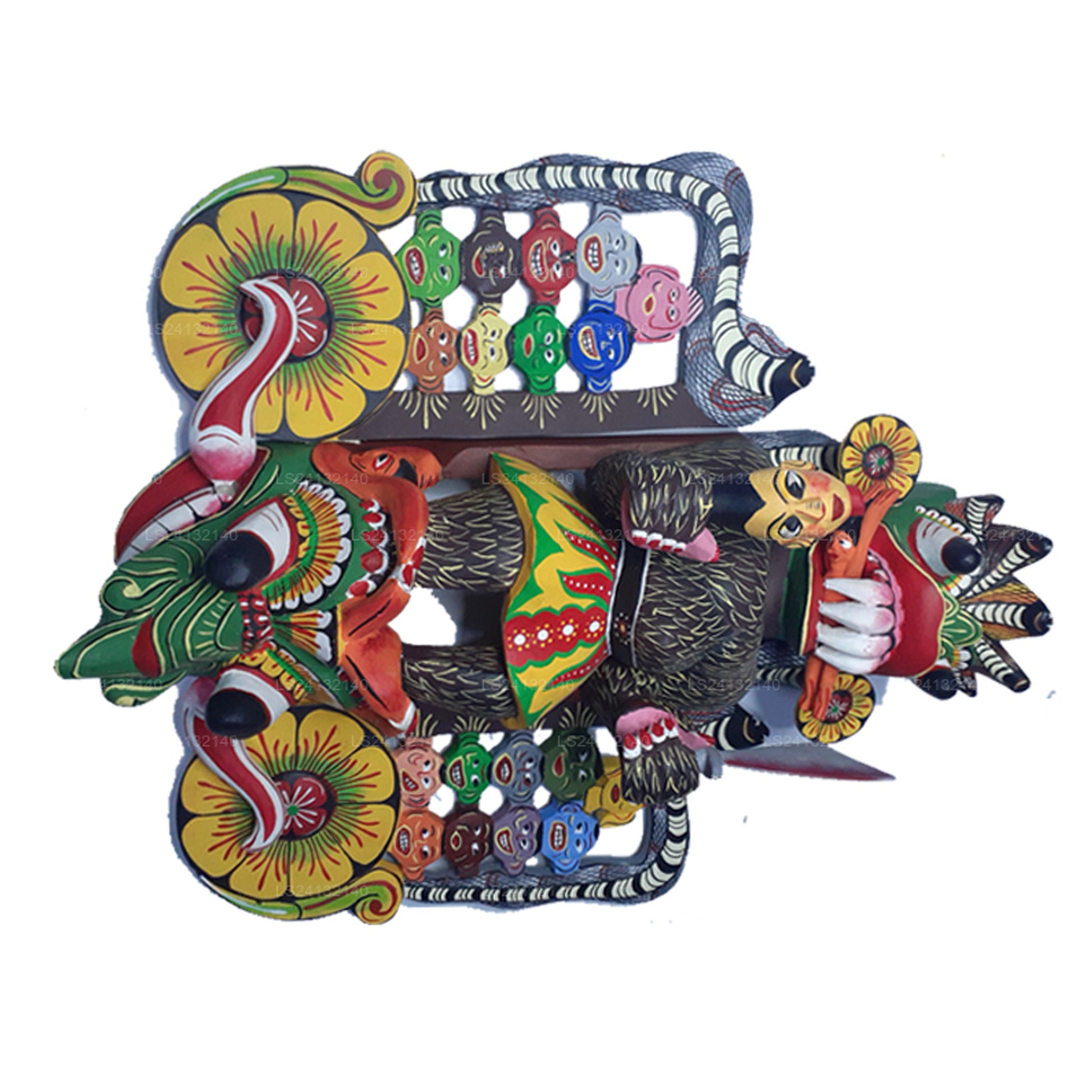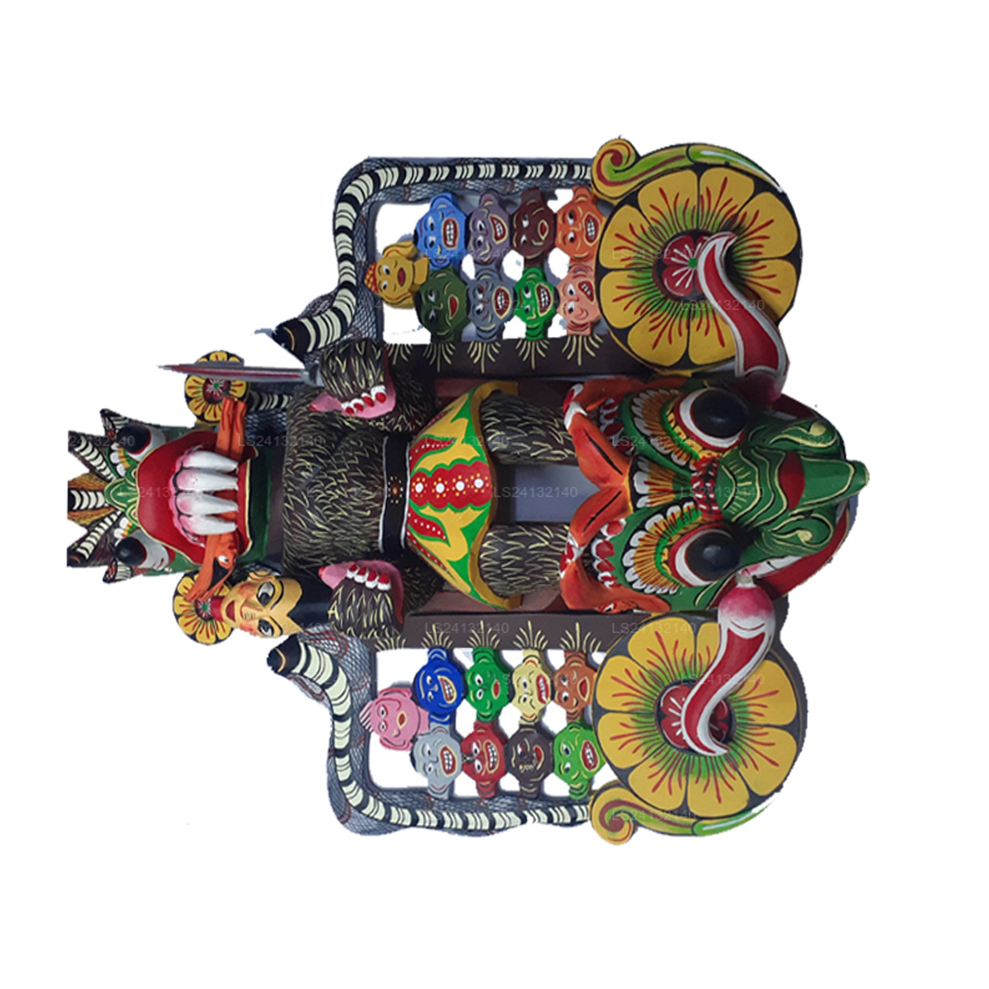 (SKU: LS21300936) マハ コラは、サンニの「悪魔」ダンスで表現される 18 人の病気の悪魔のボスです。手と口に犠牲者を抱えたマハ・コラは、ヘビと18人のサンニヤ(失明、コレラ、腫れ物、その他の疫病の悪魔)に囲まれており、それぞれに独自のマスクが与えられています。治癒の儀式が進むにつれて、儀式の専門家が患者とその家族に代わって適切な悪霊をなだめます。それが完了すると、悪霊は追い出され、その地域から残っている悪影響が儀式的に浄化されます。