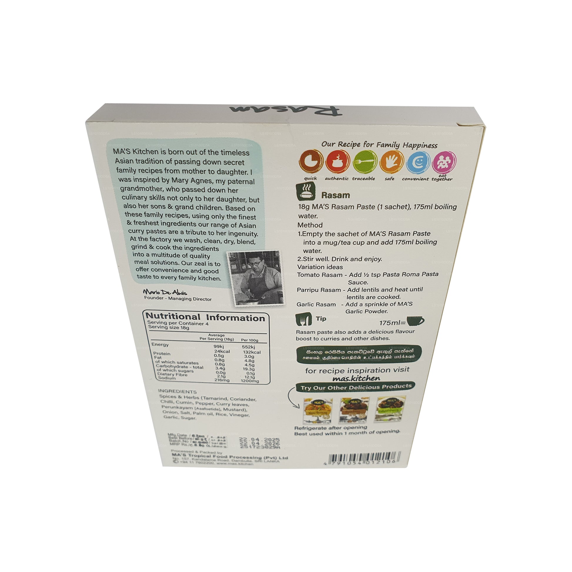(SKU: LS1010DD5A) MA's Kitchen ラッサム ペースト (72g) は、南インドの伝統的なラッサムの本格的な味を便利な形で提供します。この専門的にブレンドされたペーストは、高級スパイスと天然成分を組み合わせて、ピリッとした香り豊かな体験をもたらします。多用途で時間も節約できるので、ラッサムやその他の料理に最適です。人工添加物を一切使用していないので、南インド本来の味をそのままお楽しみいただけます。 MA のキッチン ラッサム ペーストで食事をさらにグレードアップし、豊かな南インド料理の伝統をお楽しみください。