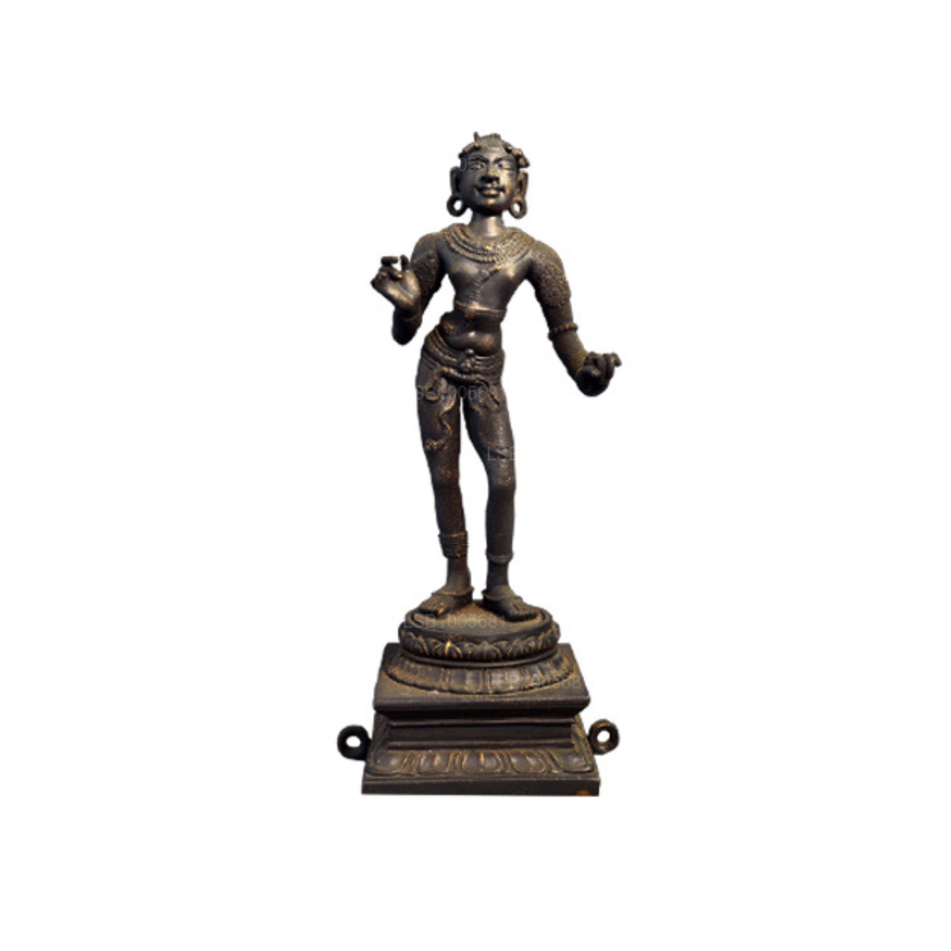 (SKU: LSB1005681) シヴァ神崇拝に熱心なスンダラスワミを表しています。この彫刻は紀元前 12 世紀に遡ります。この作品の素材として青銅が使用されていることから、ポロンナルワ時代に作られたことがわかります。シヴァ教では、彼は 63 人の聖人の一人とみなされています。スンダラスワミは、「テヴァラム」と呼ばれるヒンズー教のストラトラを書き、寺院から寺院へと歌います。ハンサムさと若々しさを示すこの彫刻はトリバンガの特徴を示し、手のしぐさはカタカハスタ ムードラを示しています。この彫刻は現在、コロンボの国立博物館に展示されています。